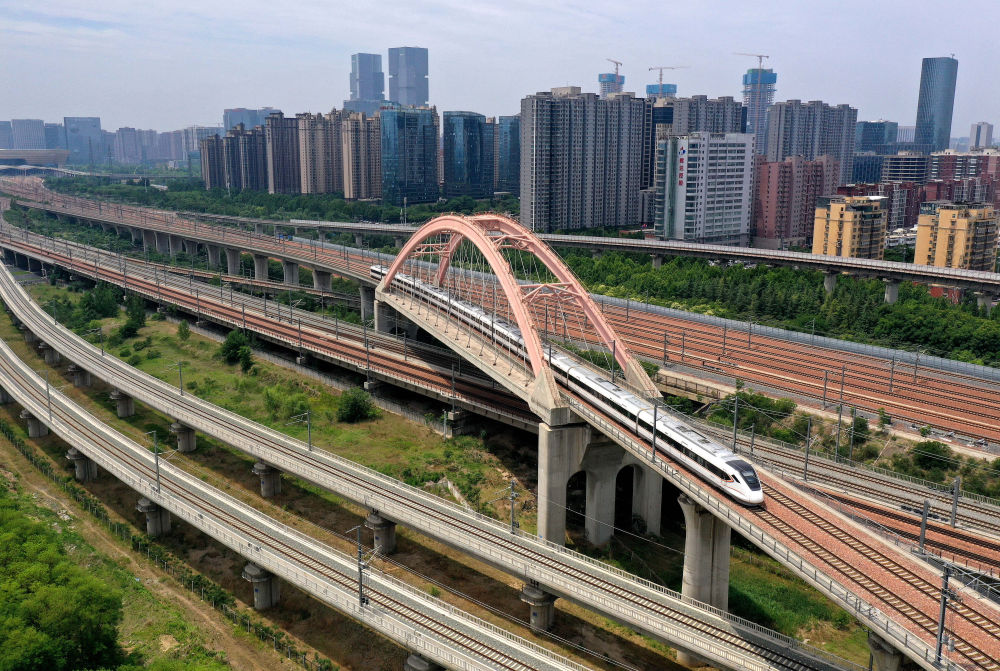 一列動車組列車行駛在鄭州東站附近的線路上(5月30日攝)。新華社記者 李安 攝