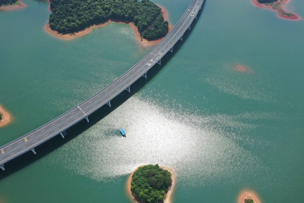 這是位于江西省九江市永修縣與武寧縣交界處的廬山西海與跨過水面的永武高速公路(無人機照片,6月7日攝)。新華社記者 周密 攝