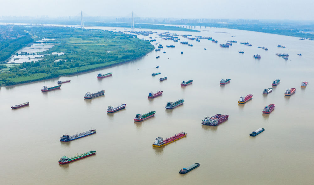 2024年6月1日,船舶在湖北武漢市陽邏港區(qū)水域行駛(無人機照片)。新華社記者 杜子璇 攝