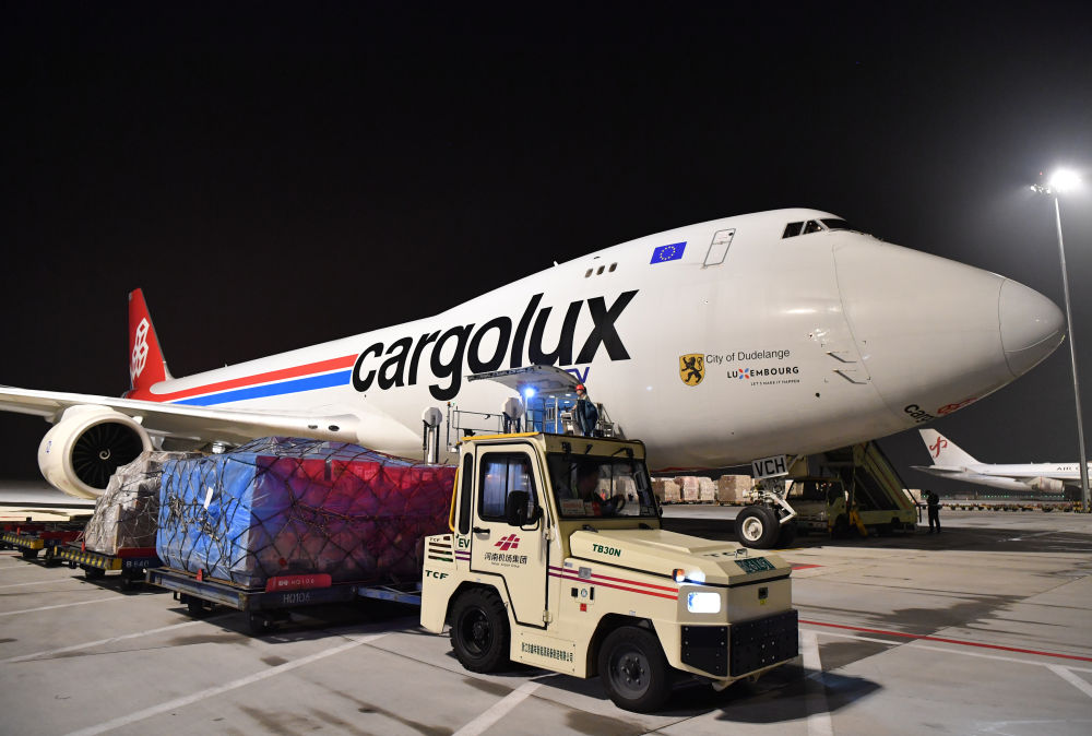 在鄭州新鄭國際機場,工作人員駕駛新能源拖車為一架盧森堡貨航貨機卸貨(2023年8月1日攝)。新華社記者 李嘉南 攝