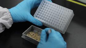 在湖南長沙的岳麓山種業(yè)創(chuàng)新中心,分子育種實驗室研究員李樂正在把脫殼的水稻種子放進(jìn)樣品盤里,隨后將樣品放置在全自動移液工作站上,進(jìn)行樣品DNA的提取。該樣品是一份田間試驗的低鎘水稻種子,這是岳麓山種業(yè)創(chuàng)新中心受種業(yè)企業(yè)委托選育的品種。