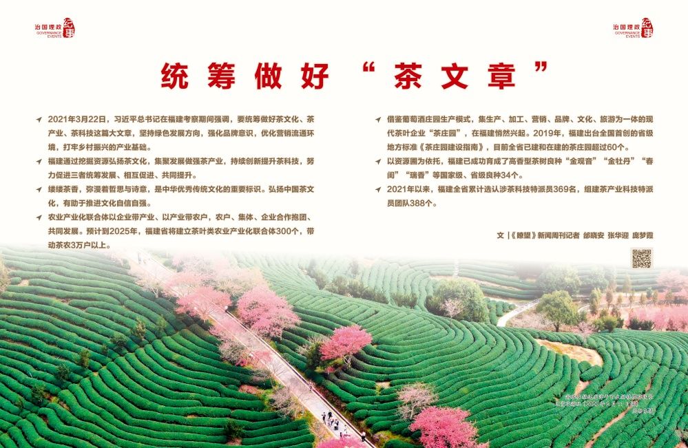2021年8月,福建省農(nóng)業(yè)農(nóng)村廳出臺(tái)《關(guān)于統(tǒng)籌做好“茶文化、茶產(chǎn)業(yè)、茶科技”這篇大文章推動(dòng)茶產(chǎn)業(yè)高質(zhì)量發(fā)展的若干意見》,制定專項(xiàng)政策措施,各茶葉重點(diǎn)市縣相繼成立工作小組、工作專班,通過挖掘資源弘揚(yáng)茶文化,集聚發(fā)展做強(qiáng)茶產(chǎn)業(yè),持續(xù)創(chuàng)新提升茶科技,努力促進(jìn)三者統(tǒng)籌發(fā)展、相互促進(jìn)、共同提升。