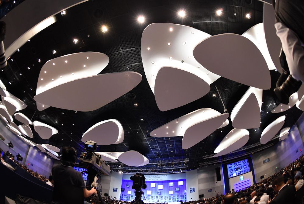 ↑這是2015年9月10日在大連拍攝的夏季達(dá)沃斯論壇開幕全會現(xiàn)場。