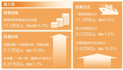 我國外貿(mào)前5月成績單近日出爐,貨物貿(mào)易進出口總值同比增長6.3%。其中,出口增長6.1%,進口增長6.4%。5月當月,進出口同比增長8.6%,出口增長11.2%,進口增長5.2%。