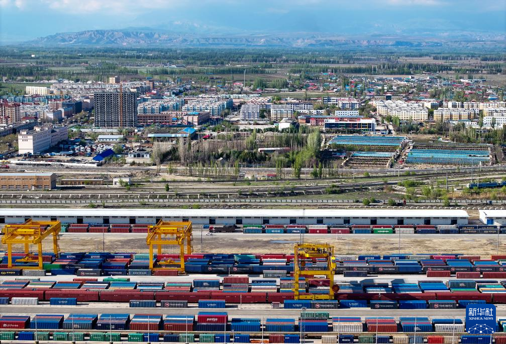 在新疆烏魯木齊國際陸港區(qū),集裝箱裝卸作業(yè)有序進行(2024年5月27日攝)。新華社記者 王菲 攝