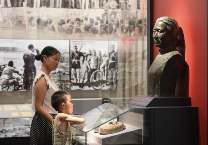 2015年7月12日,《偉大勝利 歷史貢獻》主題展覽上,觀眾在觀看“英雄母親”鄧玉芬的事跡。新華社記者 羅曉光 攝