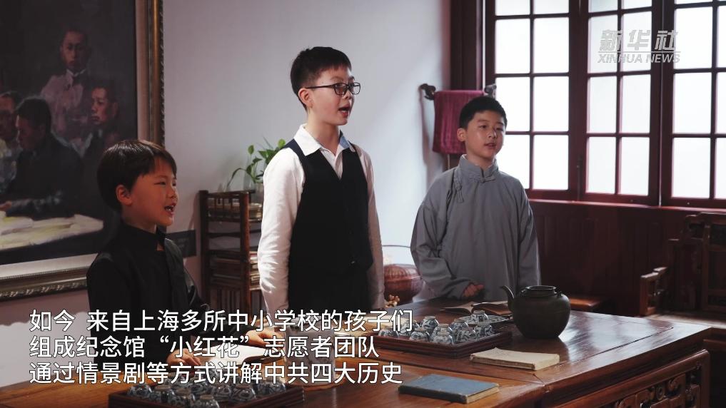 紀念館場景再現(xiàn)廳還原了當年廣吉里的會議場景:一塊寫著英文的黑板,長條桌邊圍著一圈木凳。如今,這個場景成為“紅色課堂”,來自上海多所中小學校的孩子們組成紀念館“小紅花”志愿者團隊,通過情景劇等方式,講解中共四大歷史。