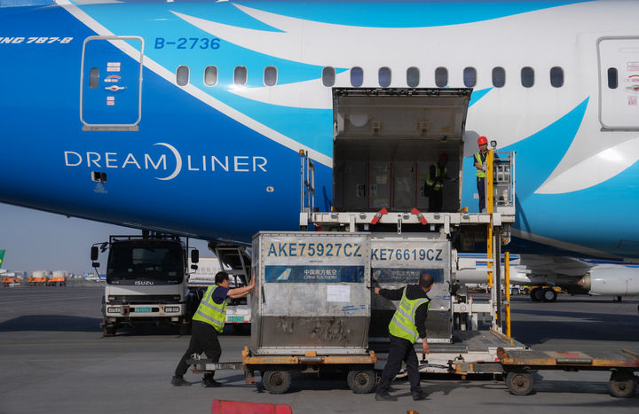 南航工作人員在烏魯木齊地窩堡國(guó)際機(jī)場(chǎng)裝卸國(guó)際航班貨物(2024年4月28日攝)。新華社發(fā)(車(chē)捷 攝)