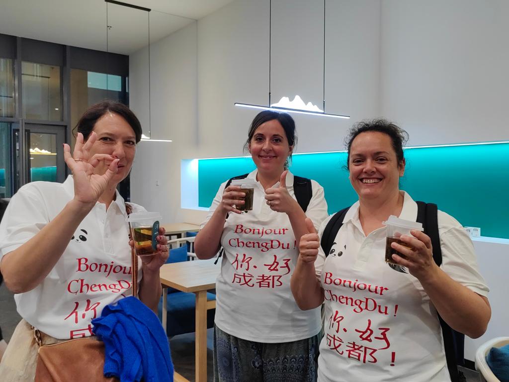7月13日,在品嘗中藥茶飲后,三名法國(guó)中醫(yī)藥愛(ài)好者表示非常滿(mǎn)意。新華社記者 董小紅 攝