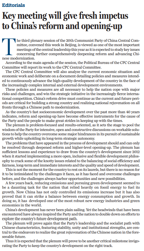 中國(guó)共產(chǎn)黨第二十屆中央委員會(huì)第三次全體會(huì)議本周在北京召開,將對(duì)進(jìn)一步全面深化改革、 推進(jìn)中國(guó)式現(xiàn)代化作出戰(zhàn)略部署。
