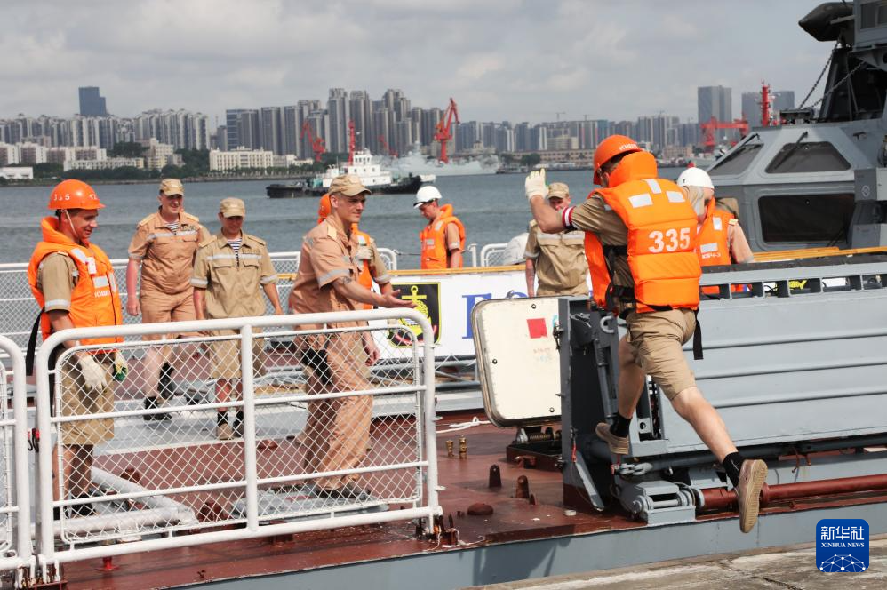 7月15日,俄“響亮”號護衛(wèi)艦艦員完成撤跳板工作后返回。新華社記者 黎云 攝
