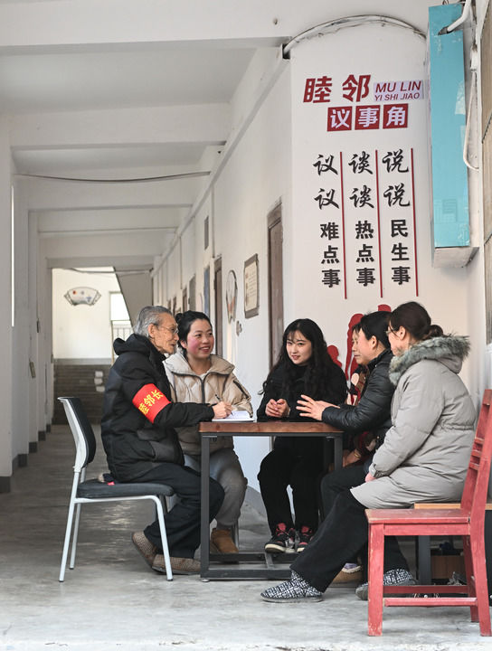 2024年1月25日,在江蘇省句容市崇明街道建新社區(qū),“睦鄰長(zhǎng)”、社區(qū)干部、網(wǎng)格員與居民代表一起議事。新華社記者 季春鵬 攝