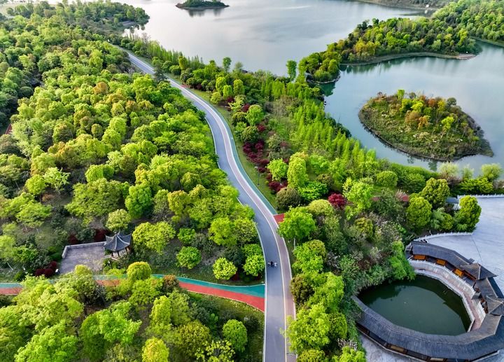 這是2022年4月5日拍攝的江西省萍鄉(xiāng)市萍水湖濕地公園(無(wú)人機(jī)照片)。萍鄉(xiāng)市將治水與綠化相結(jié)合,沿萍水河打造萍水湖濕地公園。新華社發(fā)(李桂東 攝)