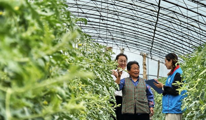 2024年4月9日,北京市大興區(qū)龐各莊鎮(zhèn)李家巷村政務(wù)服務(wù)站的工作人員來(lái)到大棚內(nèi)為瓜農(nóng)辦理社保業(yè)務(wù)。新華社記者 李欣 攝