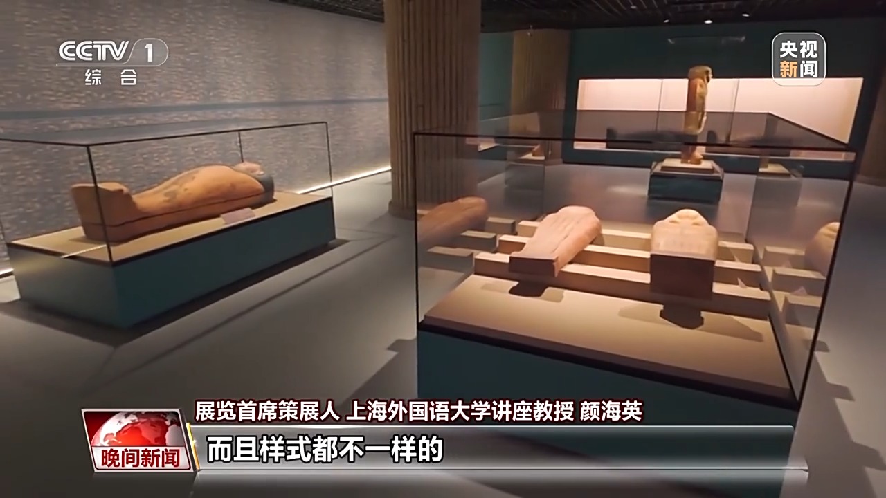 展覽首席策展人、上海外國(guó)語(yǔ)大學(xué)講座教授 顏海英:選了10個(gè)最精美的,而且樣式都不一樣的彩繪人形棺,其中最大的一個(gè)特點(diǎn)就是它的臉涂成不同的顏色,現(xiàn)在展廳里面立著一個(gè)綠臉的棺,然后還有紅臉的、黑臉的,那它具體是什么不同的象征含義,現(xiàn)在我們還沒(méi)有解讀,這是未來(lái)將要研究的問(wèn)題。