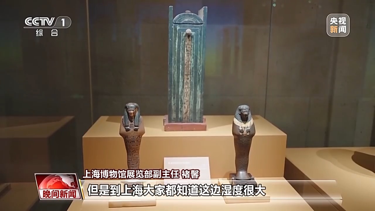 上海博物館展覽部副主任 褚馨:埃及的天氣比較干燥,它保存得特別好,但是到上海大家都知道這邊濕度很大,我們對(duì)它還進(jìn)行了脫蟲(chóng)的處理,全部處理好了以后,才放到恒溫恒濕的展柜當(dāng)中。