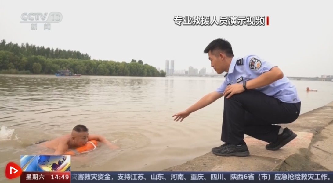 襄陽市襄城區(qū)公安分局民警高培龍介紹,大家如果發(fā)現(xiàn)有人落水,不要盲目施救,首先尋找救生衣、救生圈進行施救,千萬不要手拉手地施救,防治一起溺水??梢缘桨哆厡ふ议L竹竿,將溺水者拖上岸。