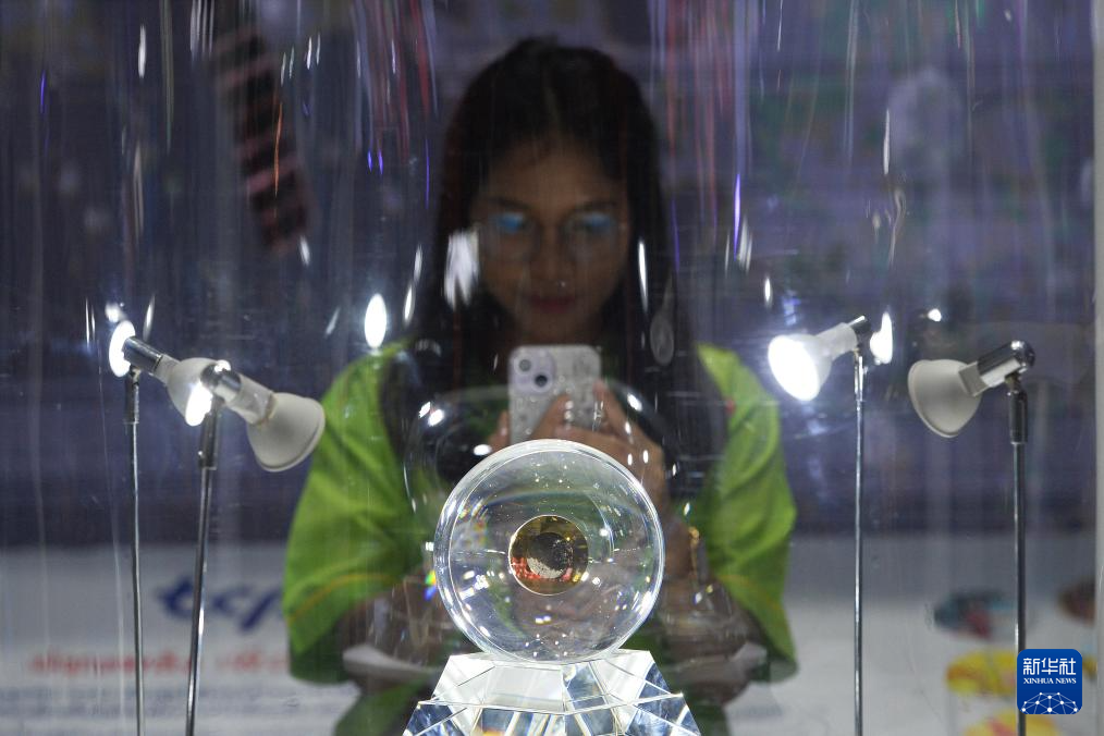 7月23日,一名女子在泰國曼谷舉行的“2024泰國未來科學力量展覽會”上拍攝展出的嫦娥五號月壤樣品。新華社發(fā)(拉亨攝)
