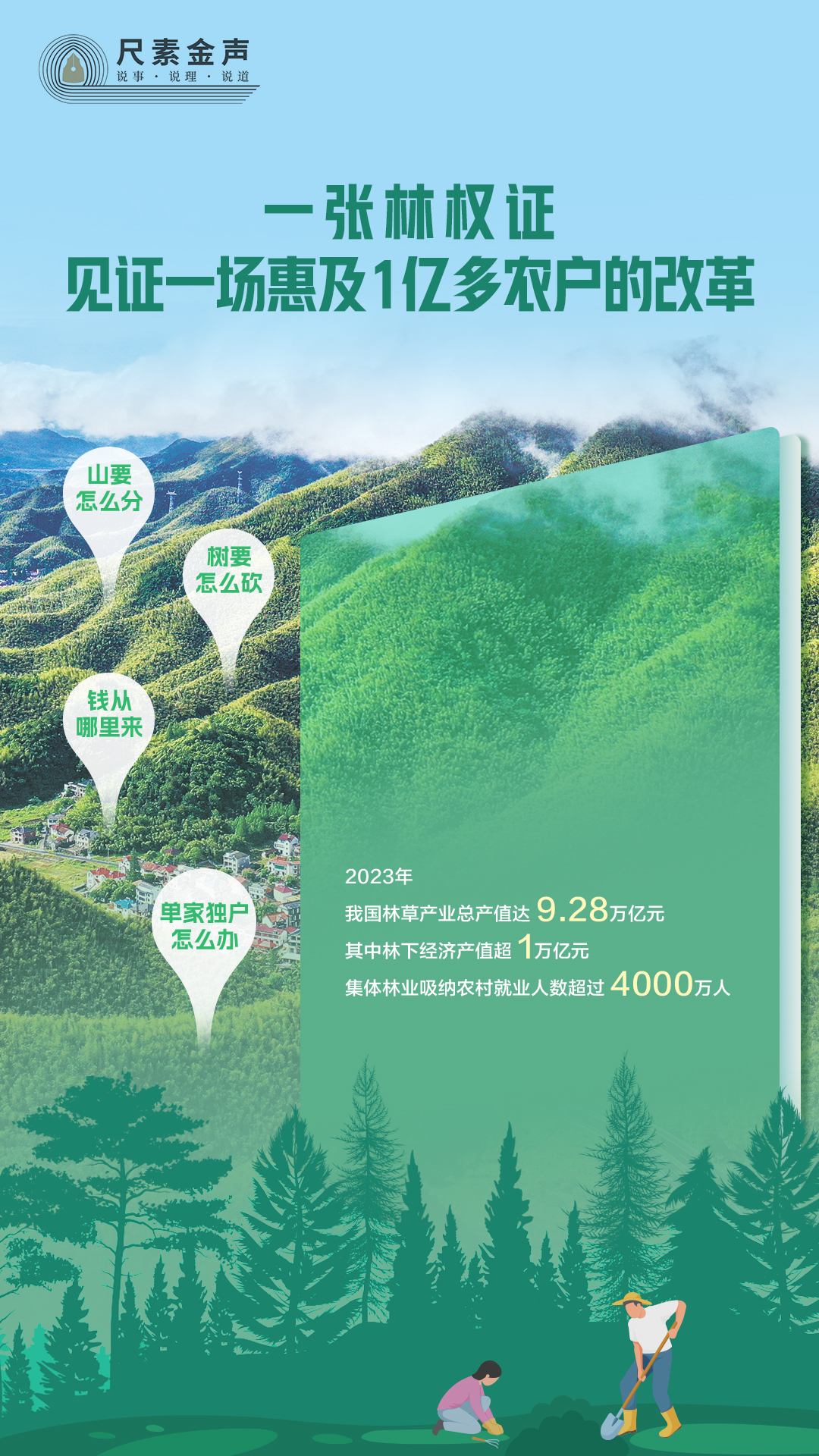 林改,改出了滿(mǎn)目青山,改出了金山銀山,廣大集體林區(qū)發(fā)展添活力,億萬(wàn)林農(nóng)鼓腰包。去年,我國(guó)林草產(chǎn)業(yè)總產(chǎn)值達(dá)9.28萬(wàn)億元,其中林下經(jīng)濟(jì)產(chǎn)值超1萬(wàn)億元,經(jīng)濟(jì)林產(chǎn)量達(dá)2.26億噸,成為繼糧食、蔬菜之后的第三大農(nóng)產(chǎn)品,集體林業(yè)吸納農(nóng)村就業(yè)人數(shù)超過(guò)4000萬(wàn)人。