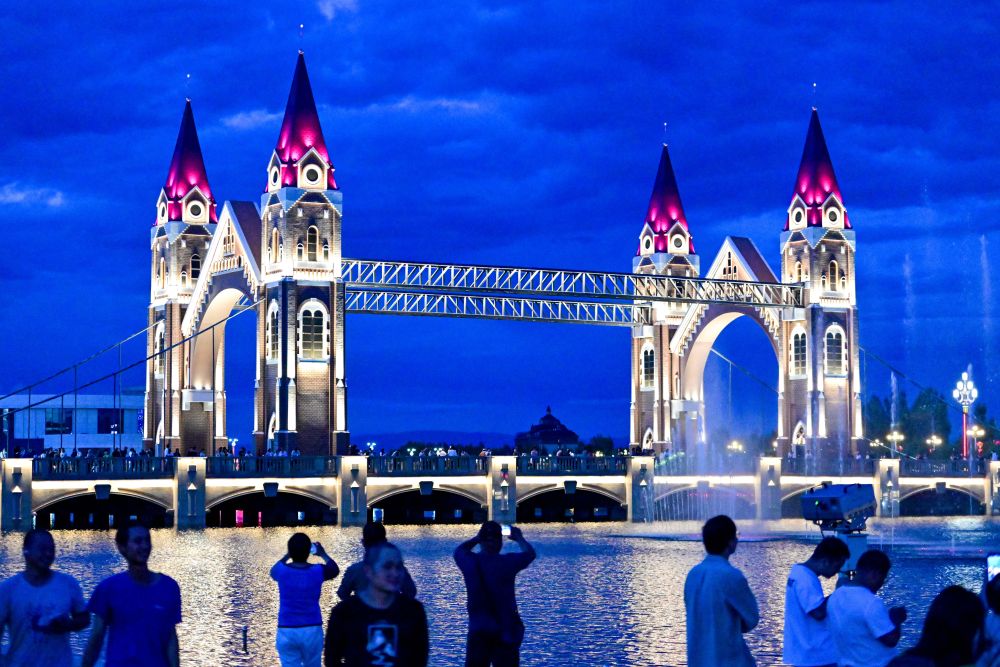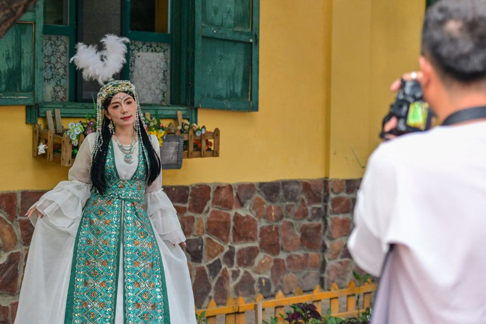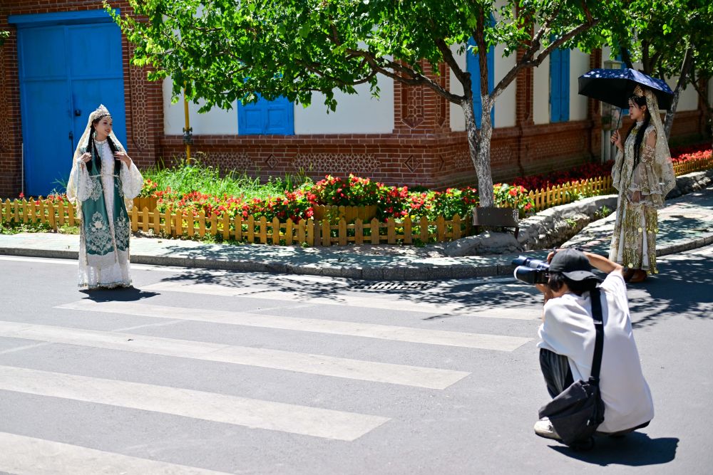 在伊犁哈薩克自治州伊寧市六星街,游客體驗(yàn)旅拍項(xiàng)目(7月27日攝)。
