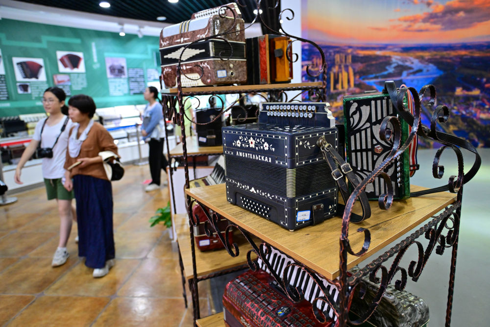 游客在新疆塔城市手風(fēng)琴文化展示廳欣賞手風(fēng)琴表演(7月24日攝)。