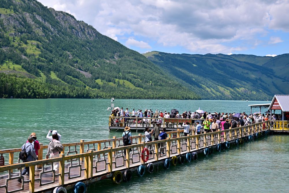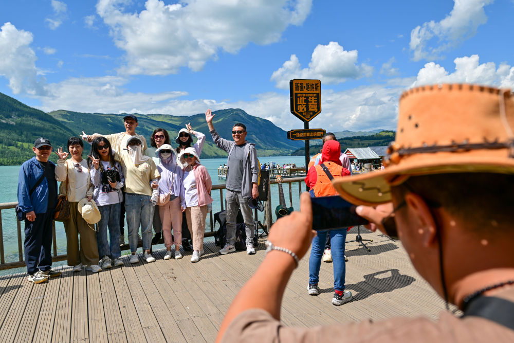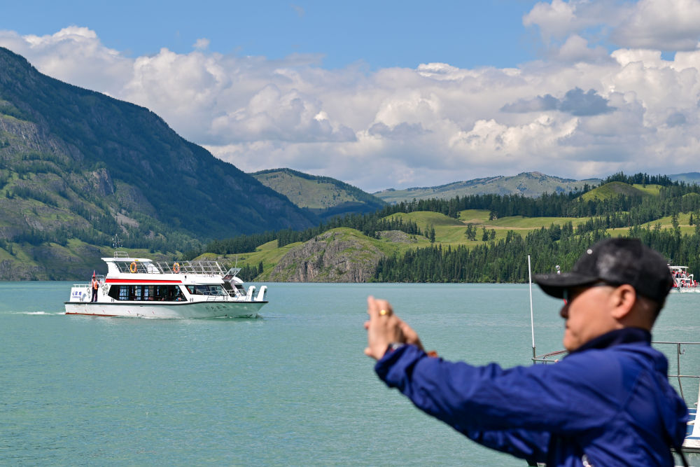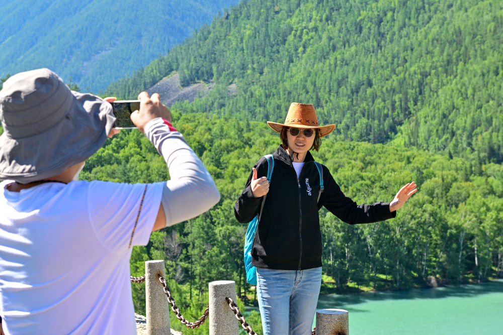 游客在新疆阿勒泰地區(qū)喀納斯景區(qū)觀光游覽(7月22日攝)。