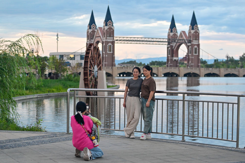 在伊犁哈薩克自治州伊寧市喀贊其民俗旅游區(qū),游客在特色民宿拍照打卡(7月27日攝)。