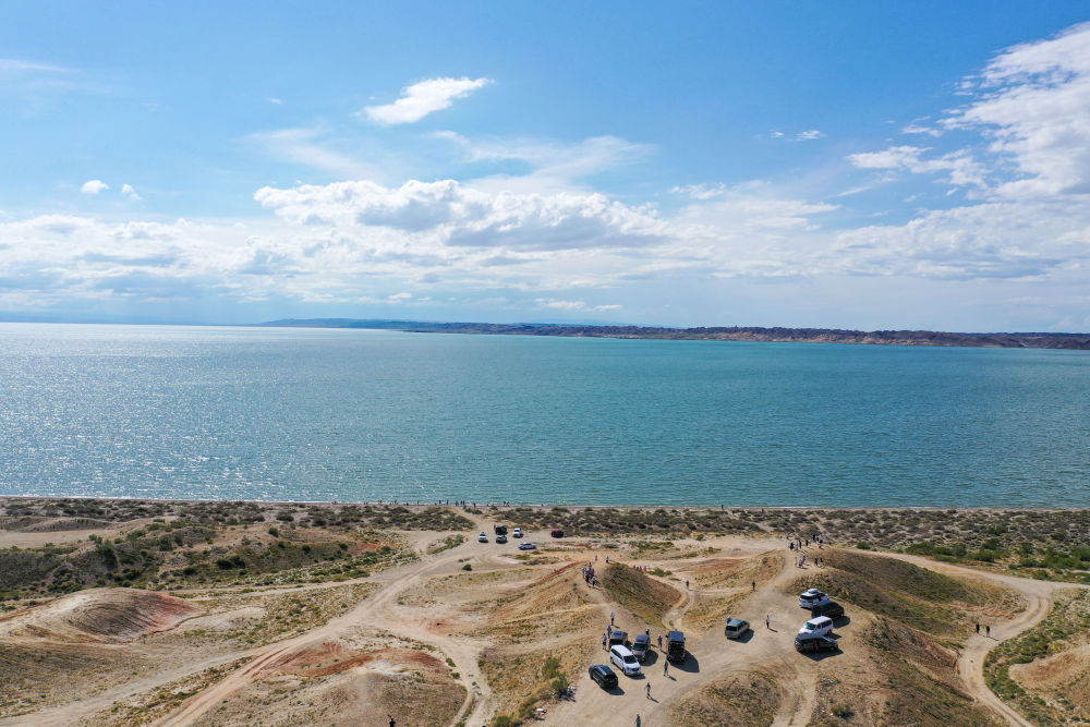 游客在新疆阿勒泰地區(qū)福??h烏倫古湖觀光游覽(7月21日攝)。