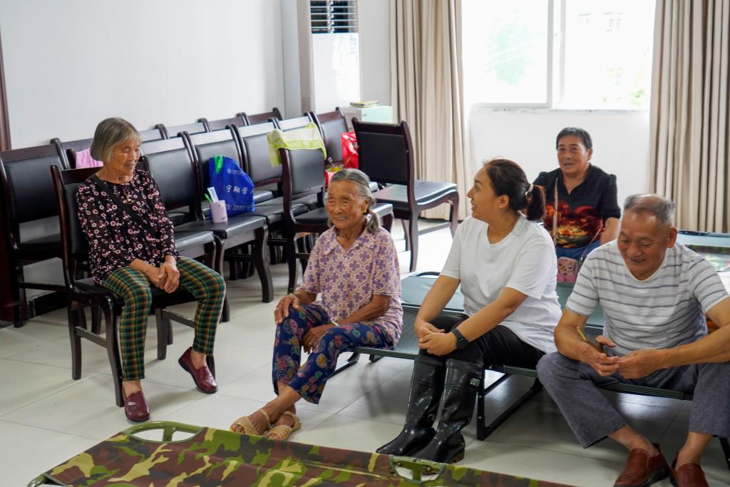 7月30日,富強村村委會辦公點內,村黨支部書記謝小紅(右二)和被安置的群眾聊天,了解他們的困難和需求。新華社記者 劉潺 攝