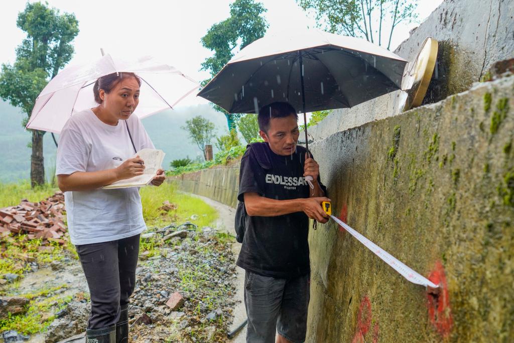 7月30日,富強村村黨支部書記謝小紅(左一)和地質災害監(jiān)測員魯業(yè)江(右一)一起對富強村一處地質災害點進行測量和監(jiān)測。新華社記者 劉潺 攝