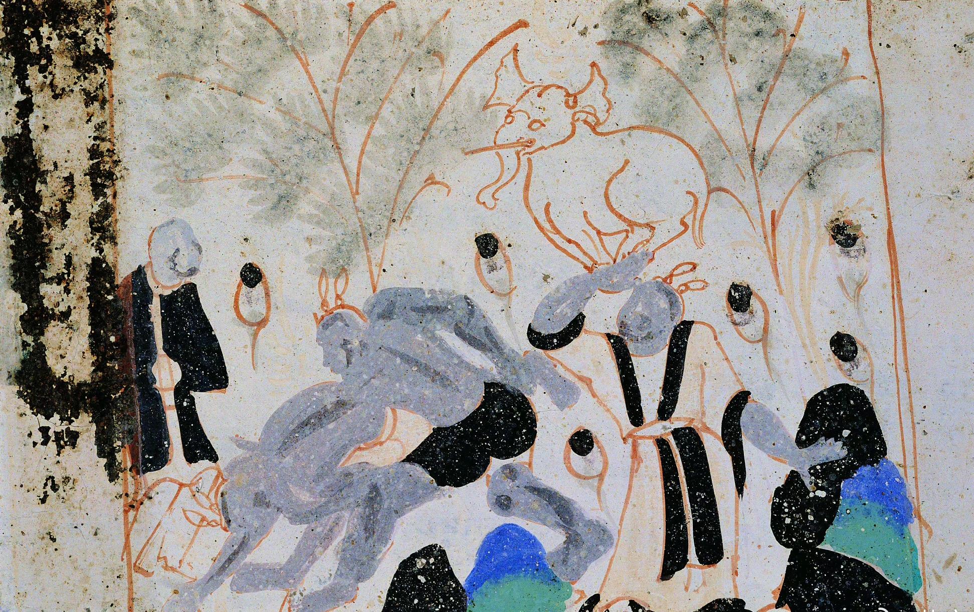 馬術:敦煌壁畫中的馬術畫,以呈現(xiàn)賽馬和馬上技巧為主。莫高窟61窟中還有一幅五代時期多人于馬上進行技巧競賽的壁畫,在開闊的草地上,一人騎在四蹄幾乎拉直飛奔的馬上,突然離鞍從一側俯身,用手撿拾放置在地上的繩索。整個場面風馳電掣,競爭激烈,展現(xiàn)出力量與速度的完美融合。莫高窟第61窟,五代。