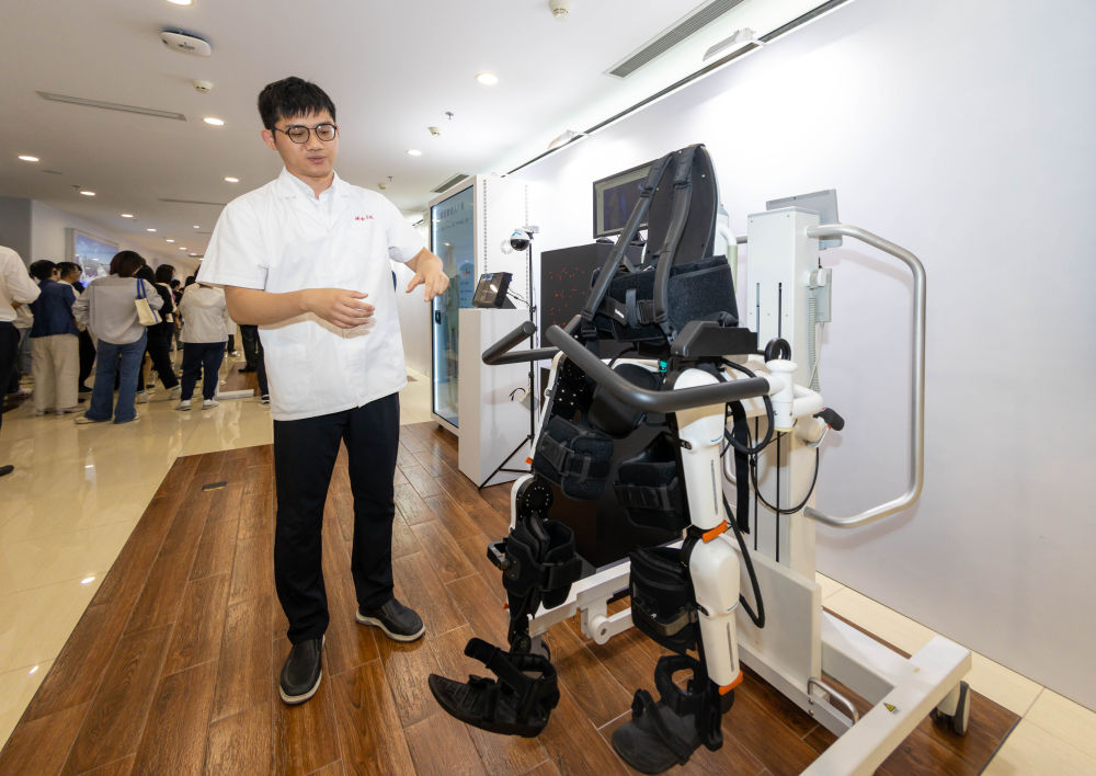 2024年5月24日,在位于上海市嘉定區(qū)的上海交通大學醫(yī)學院附屬瑞金醫(yī)院腫瘤質子中心,工作人員介紹由瑞金醫(yī)院醫(yī)生和醫(yī)療公司共同研發(fā)的用于恢復患者下肢的醫(yī)療機器人。新華社記者 王翔 攝