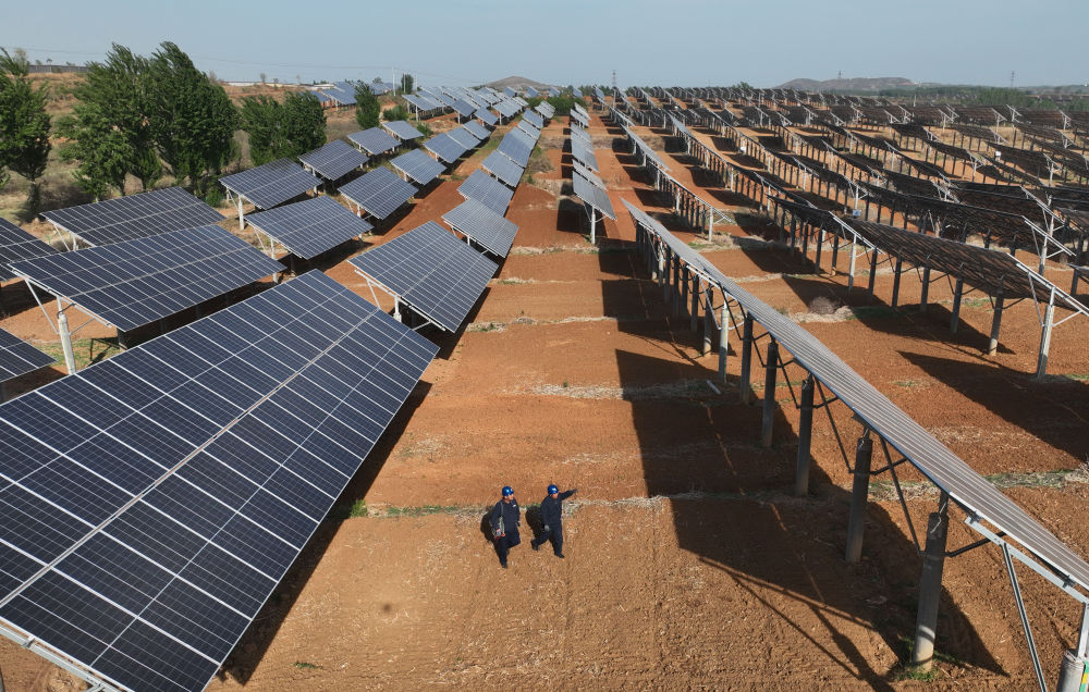 2024年4月16日,工人在河北省石家莊市靈壽縣譚莊鄉(xiāng)程家莊村的“農光互補”光伏發(fā)電場巡查(無人機照片)。新華社記者 楊世堯 攝