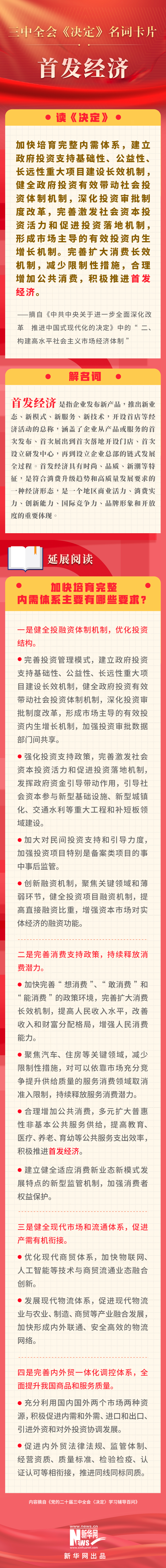 黨的二十屆三中全會審議通過了《中共中央關(guān)于進(jìn)一步全面深化改革、推進(jìn)中國式現(xiàn)代化的決定》。新華網(wǎng)依據(jù)《黨的二十屆三中全會〈決定〉學(xué)習(xí)輔導(dǎo)百問》,制作三中全會《決定》系列名詞卡片,和大家一起來深入學(xué)習(xí)領(lǐng)會二十屆三中全會精神。本期名詞是“首發(fā)經(jīng)濟(jì)”。