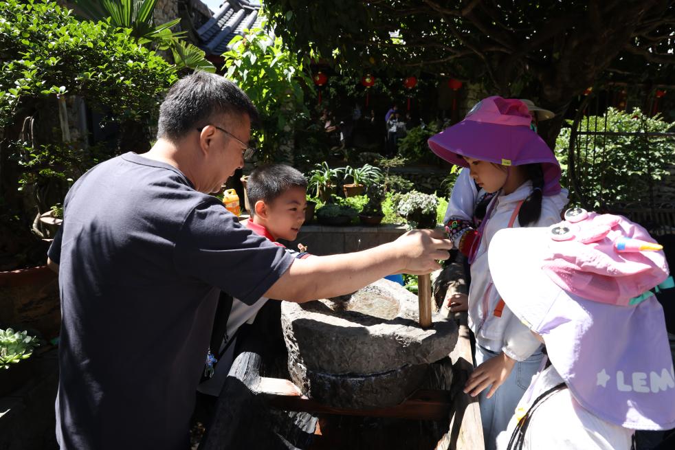 7月31日,廣西游客藍(lán)夢(mèng)婷一家在麗江市玉龍納西族自治縣玉湖村的一處納西族村民家中體驗(yàn)當(dāng)?shù)靥厣幕?。新華社記者 呂帥 攝