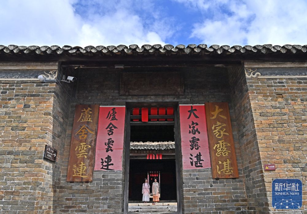 8月16日,一名身著漢服的游客在大蘆村古建筑群里跳舞(無人機照片)。