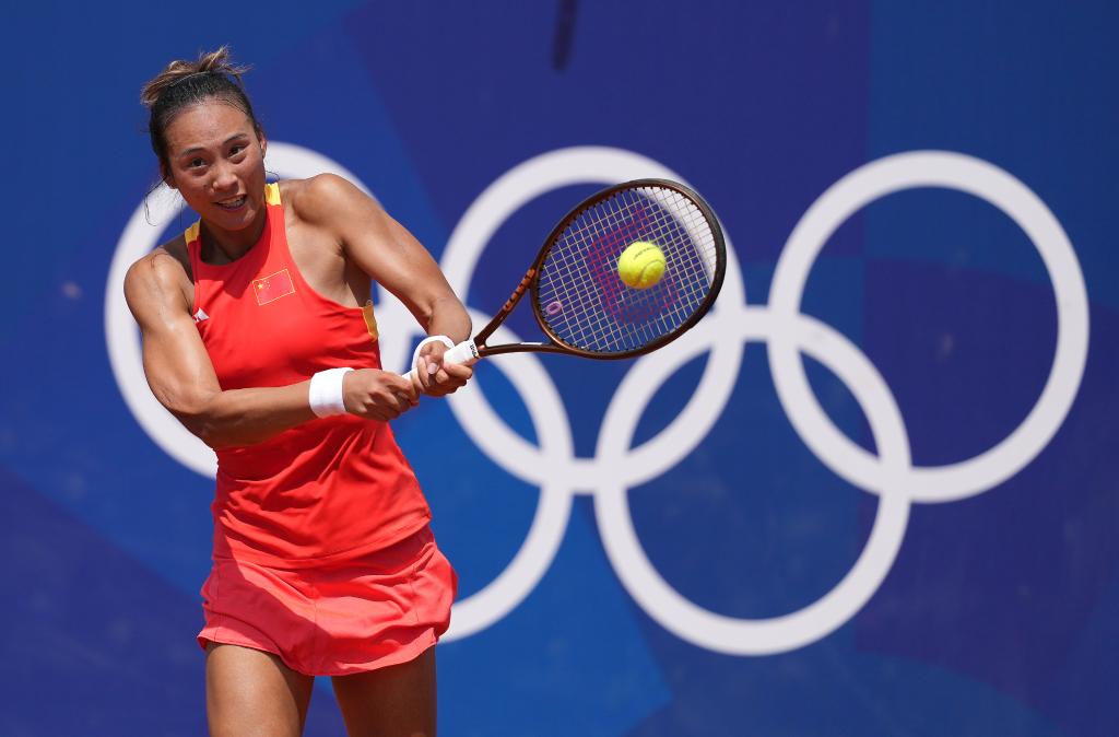 7月30日,鄭欽文在巴黎奧運會網(wǎng)球女子單打第三輪比賽中回球。新華社記者 萬象 攝
