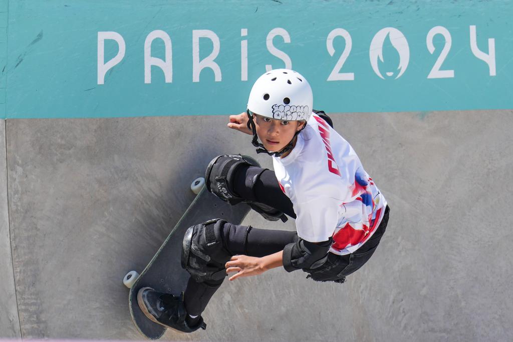 8月6日,中國選手鄭好好在巴黎奧運會滑板女子碗池預賽中。新華社記者 杜宇 攝