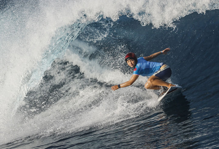 中國選手楊思琪在巴黎奧運會女子沖浪第三輪比賽中(2024年8月1日攝)。新華社記者 馬平 攝