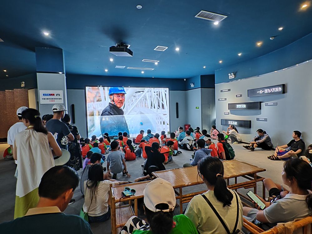 8月14日,來自河南鄭州研學(xué)團隊的中小學(xué)生在南仁東事跡館觀看影片。新華社記者 齊健 攝