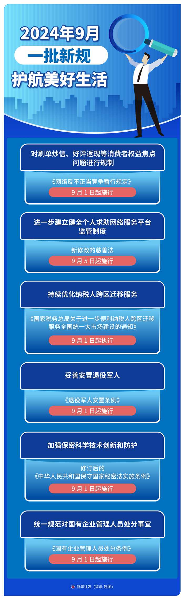 對(duì)刷單炒信、好評(píng)返現(xiàn)等消費(fèi)者權(quán)益焦點(diǎn)問題進(jìn)行規(guī)制,進(jìn)一步建立健全個(gè)人求助網(wǎng)絡(luò)服務(wù)平臺(tái)監(jiān)管制度,持續(xù)優(yōu)化納稅人跨區(qū)遷移服務(wù)……9月,一批新規(guī)護(hù)航美好生活,一起來看!