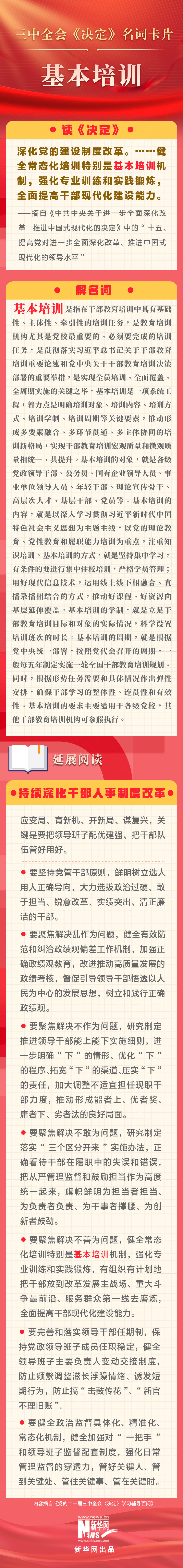 黨的二十屆三中全會審議通過了《中共中央關于進一步全面深化改革、推進中國式現(xiàn)代化的決定》。新華網(wǎng)依據(jù)《黨的二十屆三中全會〈決定〉學習輔導百問》,制作三中全會《決定》系列名詞卡片,和大家一起來深入學習領會二十屆三中全會精神。本期名詞是“基本培訓”。