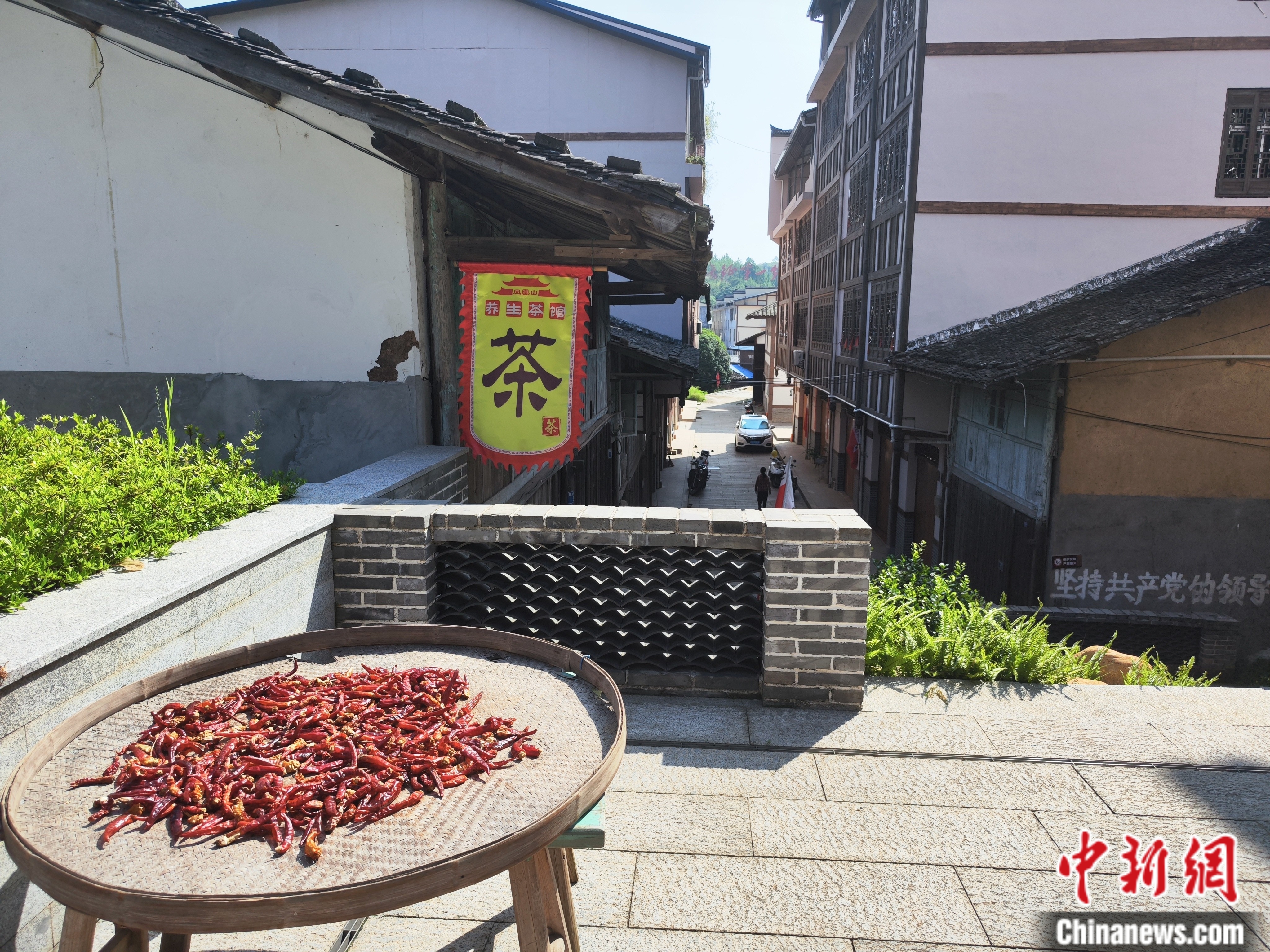 鳳凰山村內(nèi),有村民在晾曬辣椒。劉越 攝