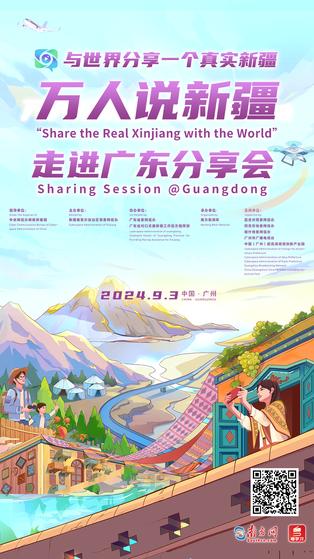 在交流互鑒中把新疆溫柔地說與全世界,在新粵兩地合作中感悟跨“粵”千里的援疆故事。“萬人說新疆”走進(jìn)廣東分享會(huì)將于9月2日至3日在廣州舉行。此次活動(dòng)由新疆維吾爾自治區(qū)黨委網(wǎng)信辦主辦,廣東省委網(wǎng)信辦、廣東省對口支援新疆工作前方指揮部協(xié)辦,南方新聞網(wǎng)承辦。分享會(huì)從國內(nèi)知名學(xué)者、外籍專家、海內(nèi)外博主、援疆干部、港澳青年等不同視角,講述有溫度、有情懷、接地氣的美好新疆故事。