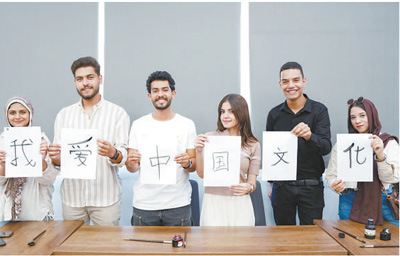 7月3日,埃及中國(guó)圖書中心揭牌儀式在埃及開羅巴德?tīng)柎髮W(xué)舉辦。圖為參加活動(dòng)的埃及大學(xué)生展示書法。