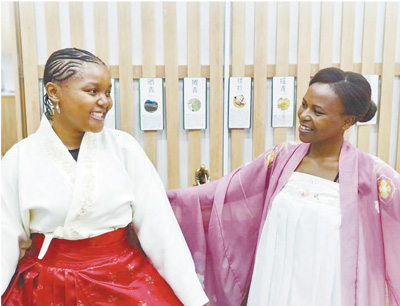 當(dāng)?shù)貢r(shí)間4月20日,為慶祝第十五個(gè)聯(lián)合國(guó)中文日,南非德班理工大學(xué)孔子學(xué)院舉辦以“說(shuō)文解字,以茶會(huì)友”為主題的活動(dòng)。活動(dòng)參與者身穿中國(guó)傳統(tǒng)服飾,共同探討漢字和茶文化。圖為兩名當(dāng)?shù)嘏⒃嚧┲袊?guó)傳統(tǒng)服飾。