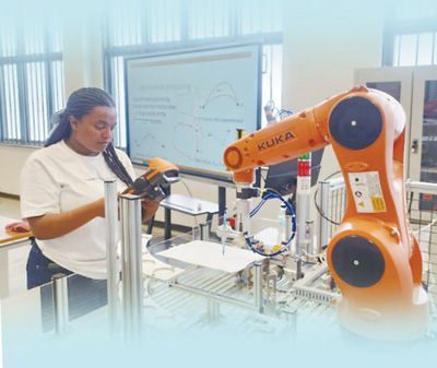 埃塞俄比亞魯班工坊由天津職業(yè)技術(shù)師范大學(xué)與埃塞聯(lián)邦職業(yè)技術(shù)培訓(xùn)學(xué)院合作建立,于2021年4月揭牌啟運(yùn),聚焦人工智能領(lǐng)域,對(duì)接當(dāng)?shù)睾献髟盒5碾姎庾詣?dòng)化與控制技術(shù)管理等專業(yè)。圖為當(dāng)?shù)貙W(xué)生在操作工業(yè)機(jī)器人。