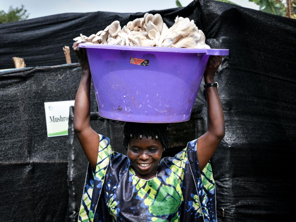 2月6日,在中非共和國達(dá)馬拉,法蒂瑪在菇棚內(nèi)收獲菌草菇。