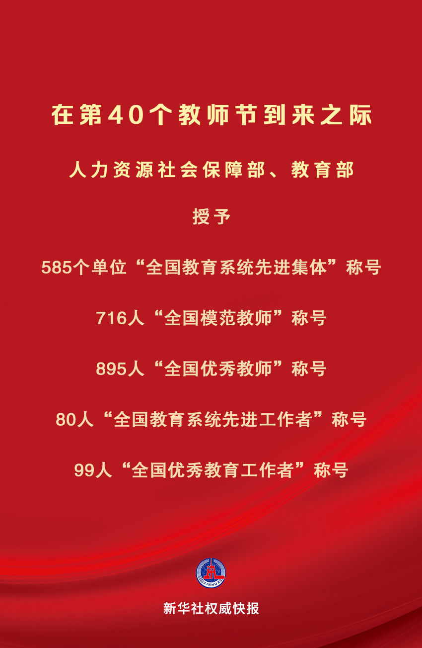 在中華人民共和國成立75周年和第40個(gè)教師節(jié)到來之際,為大力弘揚(yáng)教育家精神,營造全社會(huì)尊師重教濃厚氛圍,激勵(lì)全國廣大教師和教育工作者落實(shí)立德樹人根本任務(wù),積極投身教育強(qiáng)國建設(shè),人力資源社會(huì)保障部、教育部決定授予中央財(cái)經(jīng)大學(xué)金融學(xué)院等585個(gè)單位“全國教育系統(tǒng)先進(jìn)集體”稱號(hào);授予刁榮春等716名同志“全國模范教師”稱號(hào);授予于淵等895名同志“全國優(yōu)秀教師”稱號(hào);授予王彥平等80名同志“全國教育系統(tǒng)先進(jìn)工作者”稱號(hào);授予王軍等99名同志“全國優(yōu)秀教育工作者”稱號(hào)。