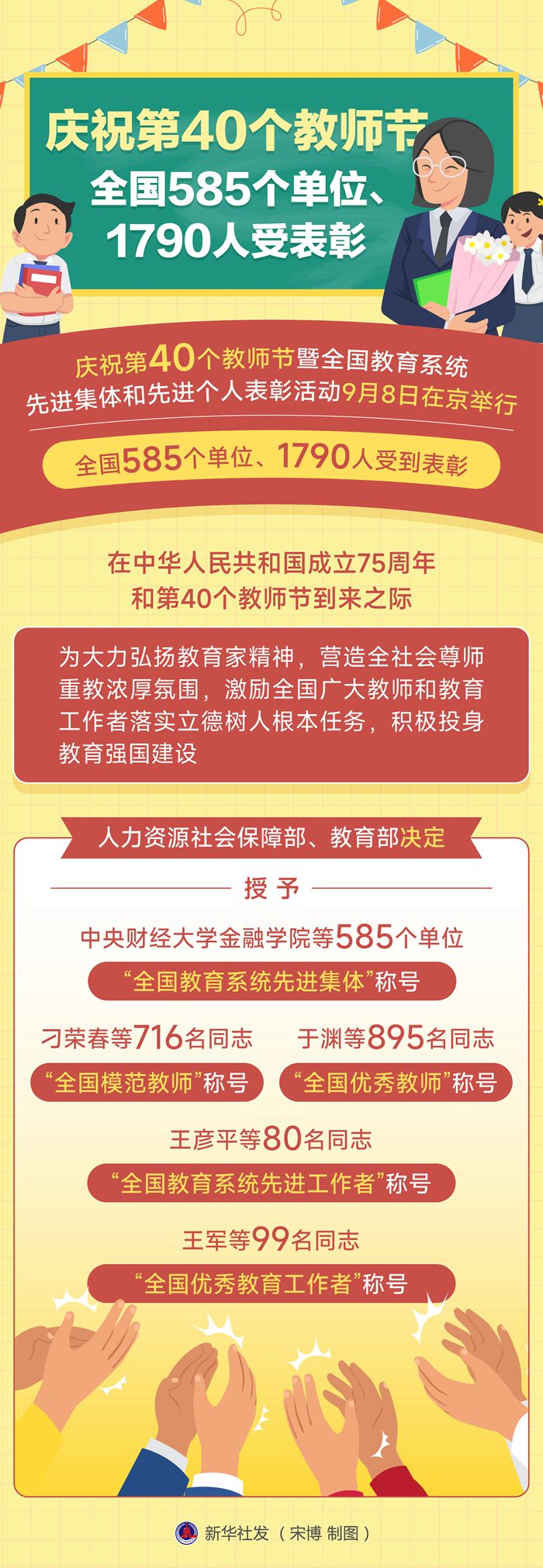 在中華人民共和國成立75周年和第40個教師節(jié)到來之際,為大力弘揚教育家精神,營造全社會尊師重教濃厚氛圍,激勵全國廣大教師和教育工作者落實立德樹人根本任務(wù),積極投身教育強國建設(shè),人力資源社會保障部、教育部決定授予中央財經(jīng)大學金融學院等585個單位“全國教育系統(tǒng)先進集體”稱號;授予刁榮春等716名同志“全國模范教師”稱號;授予于淵等895名同志“全國優(yōu)秀教師”稱號;授予王彥平等80名同志“全國教育系統(tǒng)先進工作者”稱號;授予王軍等99名同志“全國優(yōu)秀教育工作者”稱號。